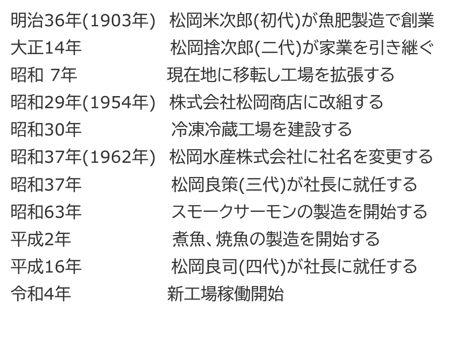 1962: Changed company name to Matsuoka Suisan Co., Ltd.