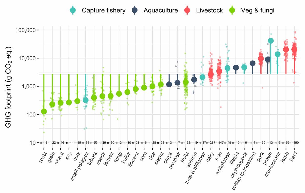 鯖などのSmall Pelagics(左から6番目)は、植物であるナッツ類と同等のCO2排出量