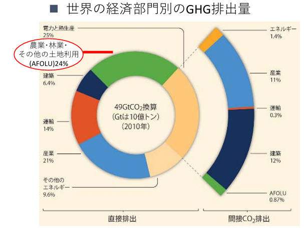 世界のGHG排出量は、490億トン(CO2換算)。このうち、農業・林業・その他土地利用の排出は世界の排出全体の1/4